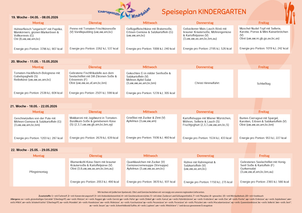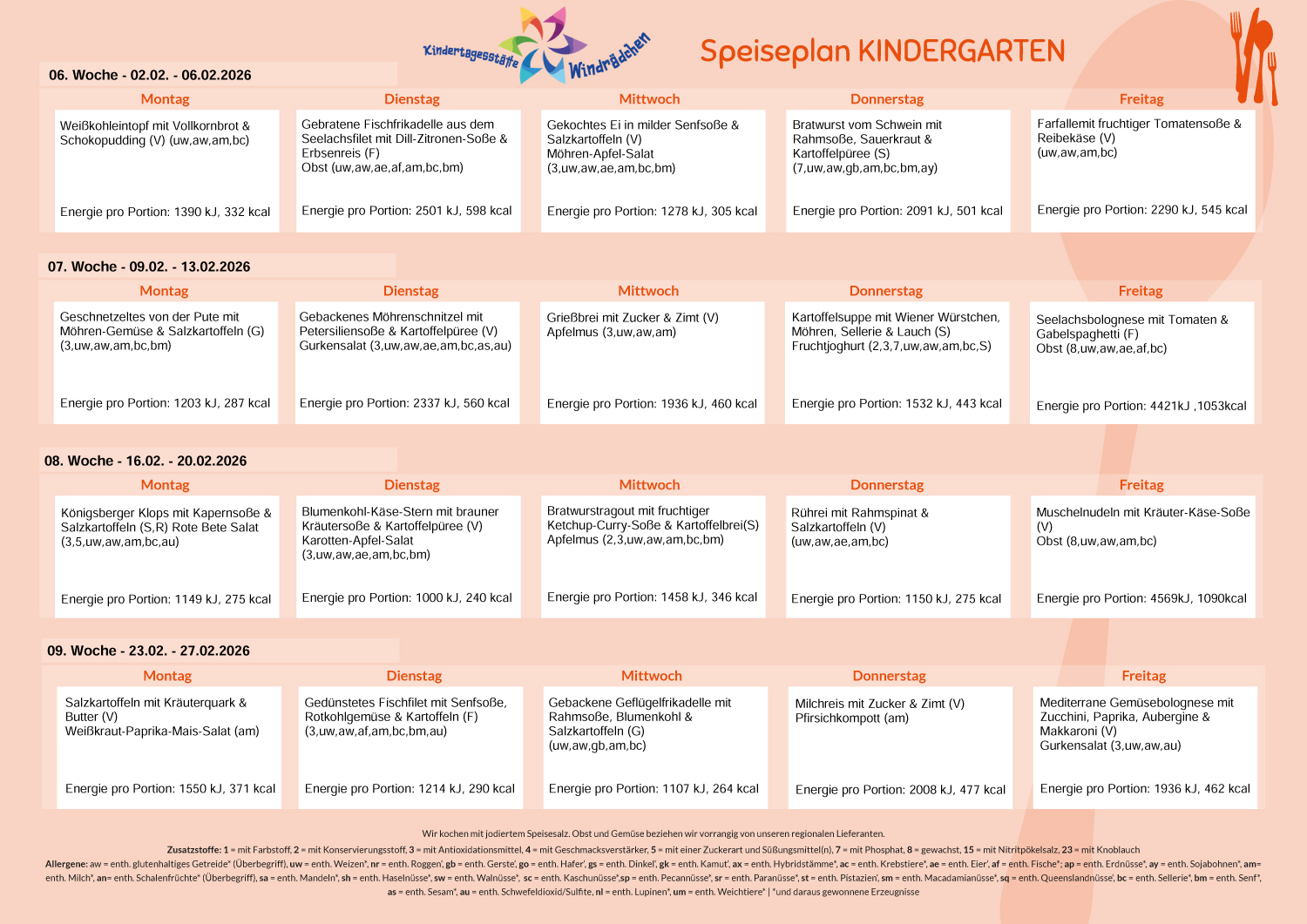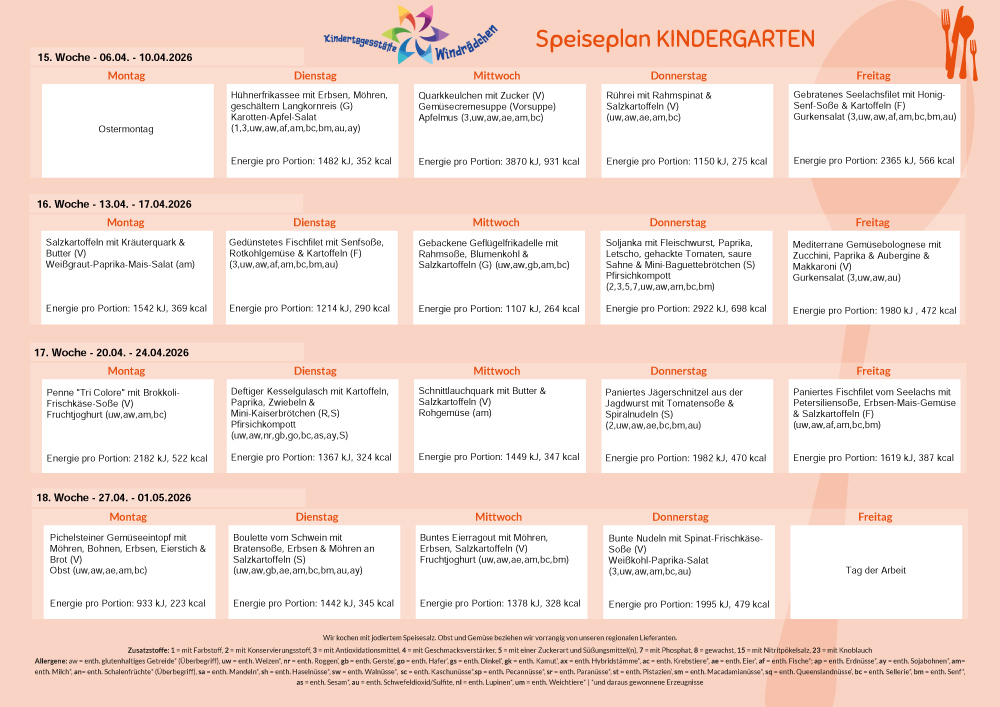 Eine ausgewogene Verpflegung ist die Basis für einen abwechslungsreichen, vielfältigen Tag und liefert Energie zum Wachsen und Lernen. Dabei richtet sich der Anbieter nach den Qualitätsstandards der Deutschen Gesellschaft für Ernährung in Kitas.